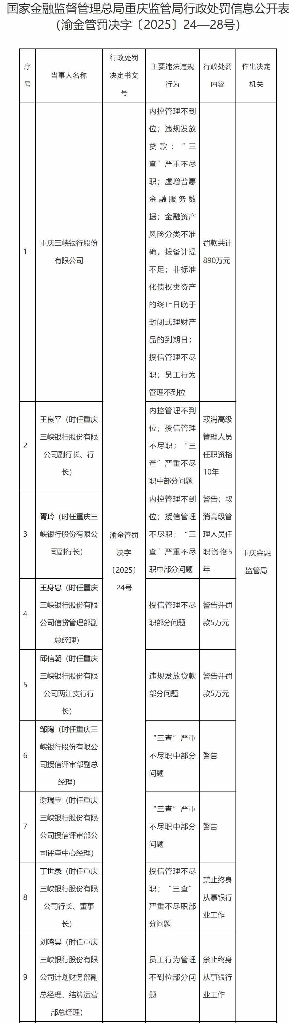 邱信朝,时任重庆三峡银行两江支行行长,因对违规发放贷款部分问题的违法违规行为负有责任,被警告并罚款5万元;