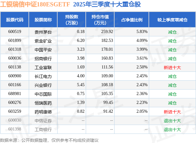 从基金规模来看,工银瑞信中证180ESGETF基金2025年三季度公布的基金规模为0.45亿元,较上一期规模4532.56万元变化了-74.85万元,环比变化了-1.65%。该基金最新一期资产配置为:股票占净值比98.85%,无债券类资产,现金占净值比1.02%。从基金持仓来看,该基金当季前十大股票仓位达31.54%,第一大重仓股为贵州茅台(600519),持仓占比为5.83%。